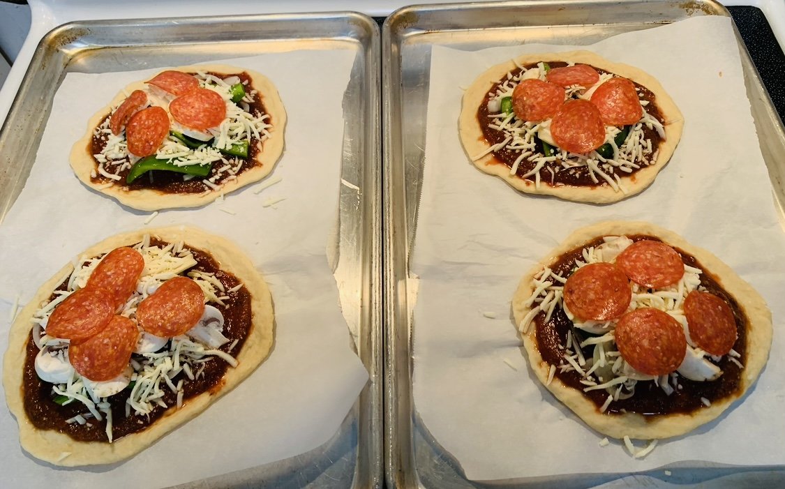 Mix together all of the ingredients for the pizza crust. Divide dough into 4 balls. Roll the dough into desired shape. Put onto a baking sheet. I like to line the baking sheets with parchment paper so it doesn’t stick and also to make it easy to transport to another container or plate. Here is the parchment paper I like to use: https://amzn.to/3GdfISr (click on the link). These are my favorite baking sheets. I like them because they are aluminum making them durable and I can use them for many baking purposes. I also prefer aluminum over nonstick type of surfaces which can peel off or chip over time. https://amzn.to/3Cl9GOL (Click on the link).