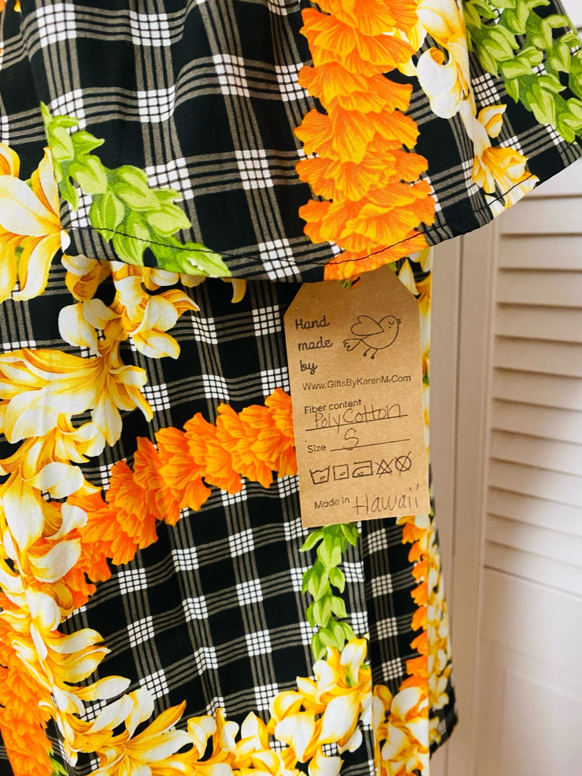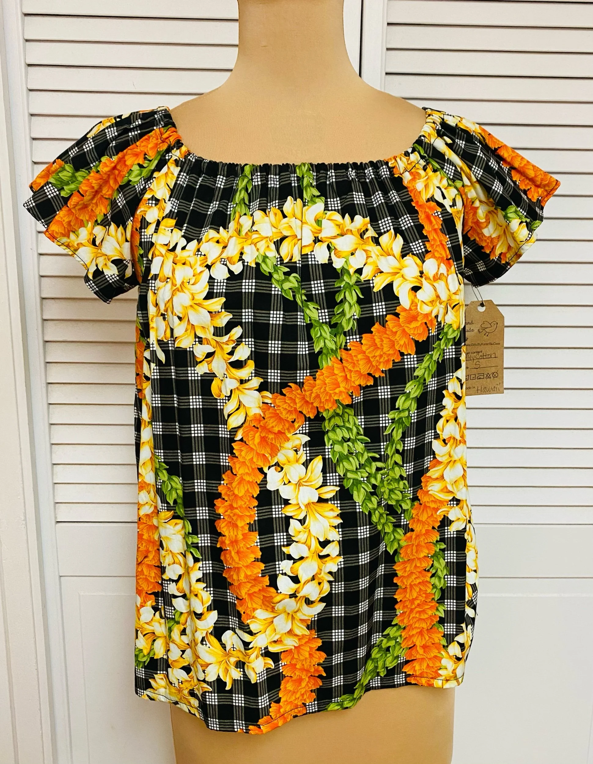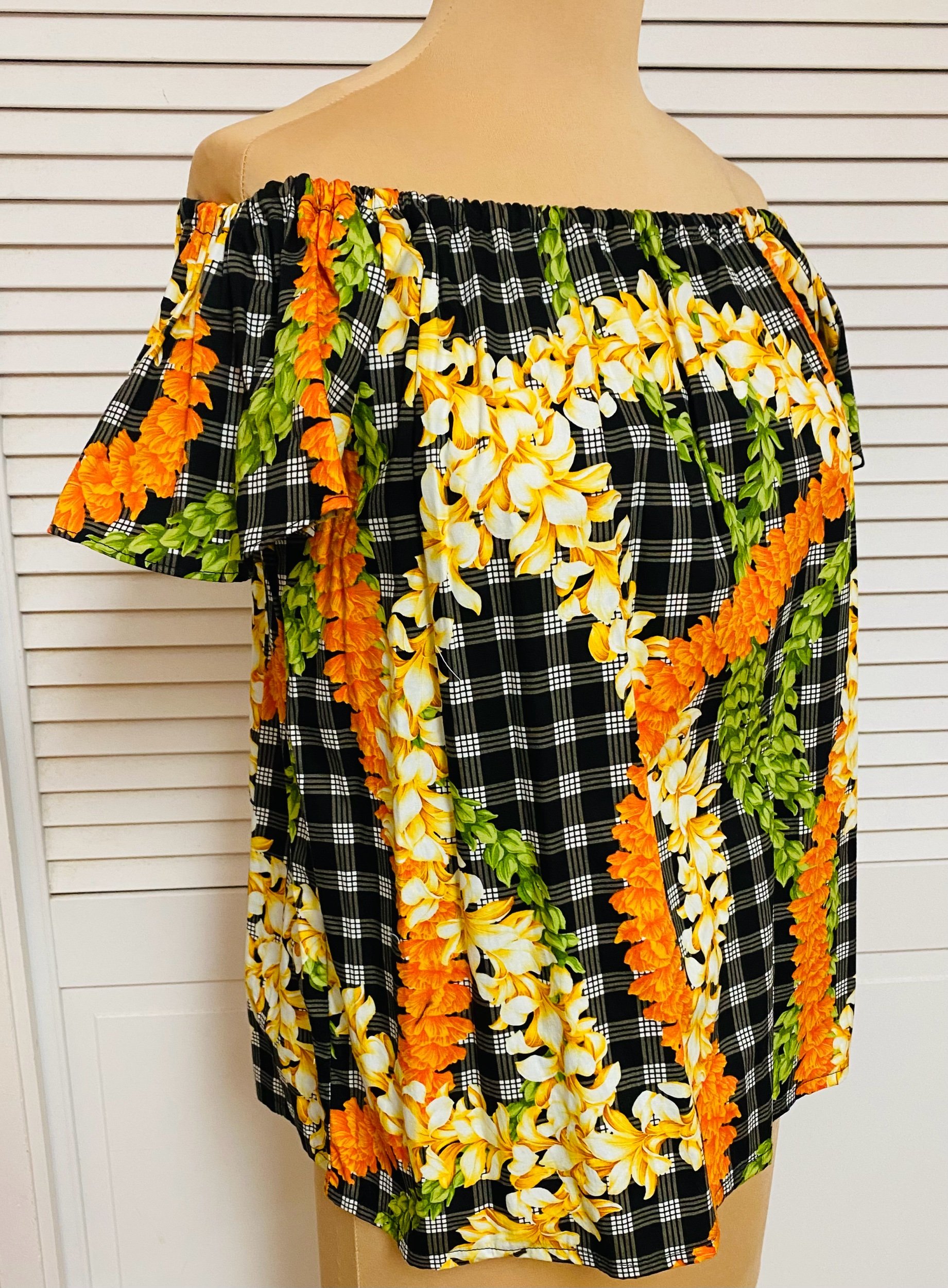 Black poly cotton lei print on off the shoulder blouse. Size Small. This listing is for this exact blouse. Handmade by the seller. A great gift for a friend!