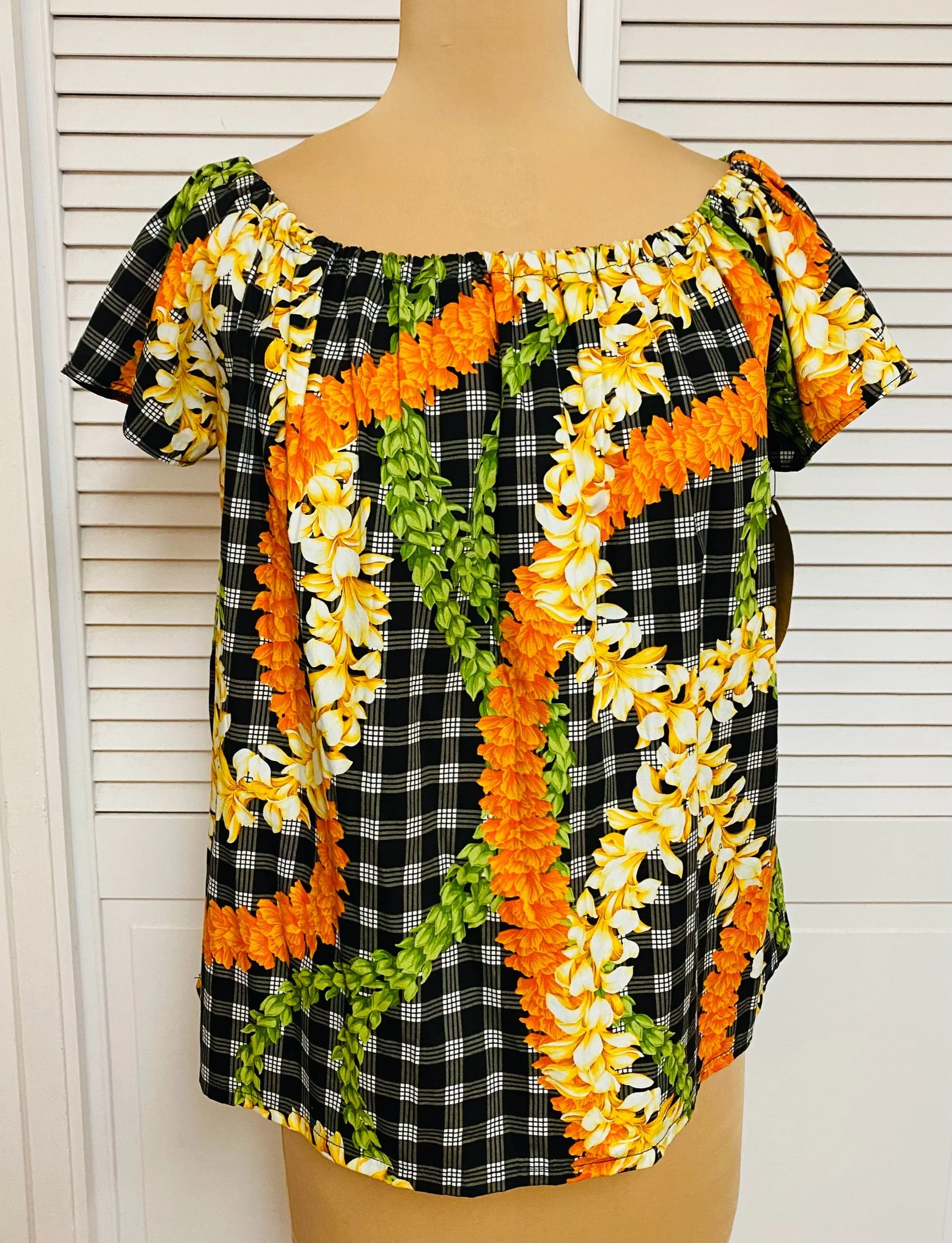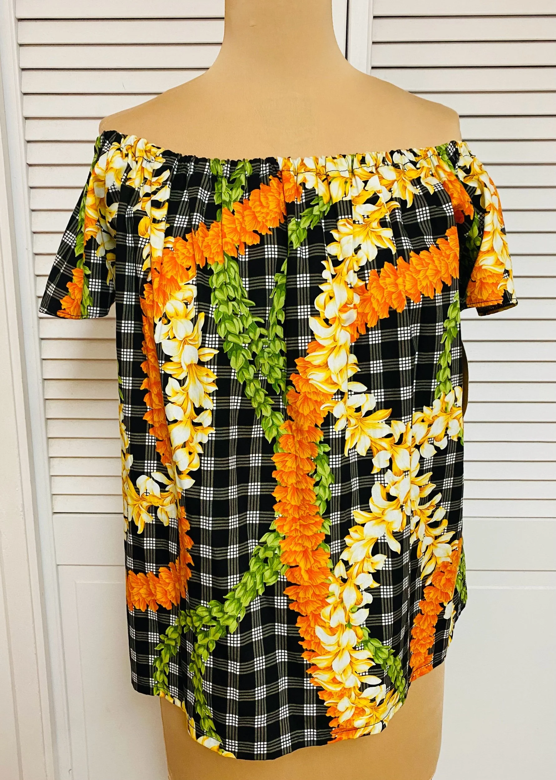 Black poly cotton lei print Palaka on off the shoulder blouse. Size medium. This listing is for this exact blouse pictured. A great gift for a loved one!