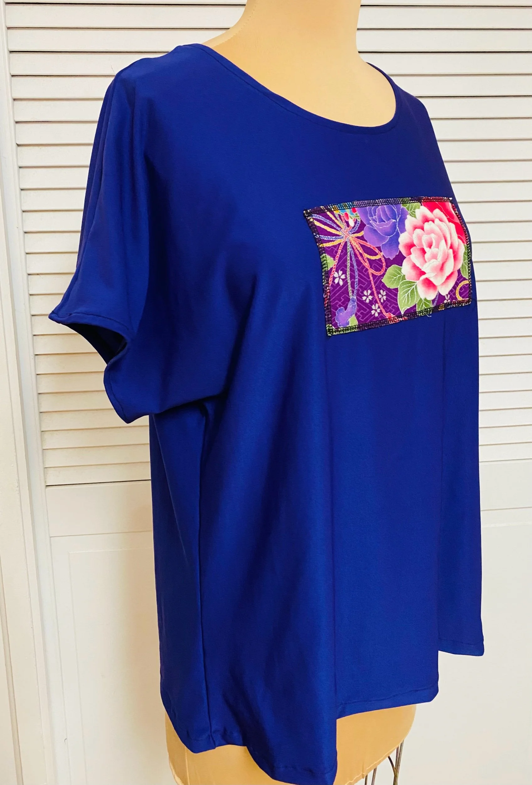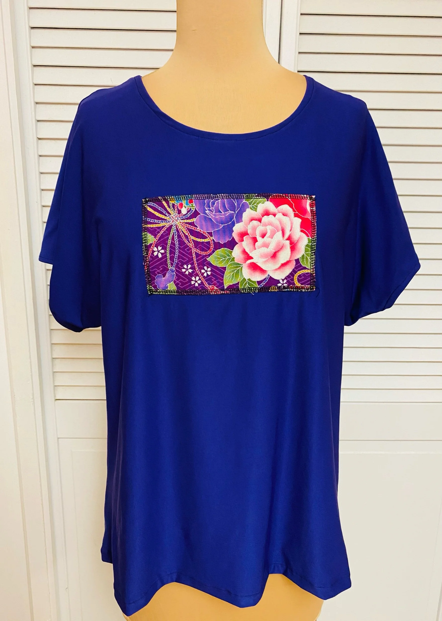 Oriental block patch on purple raglan sleeve blouse size Large. This is the exact blouse. Polyester stretch knit. Handmade by the seller. A great gift!