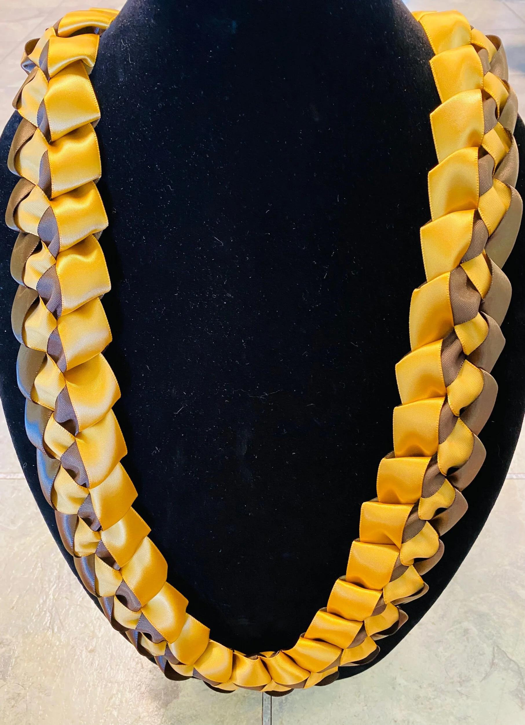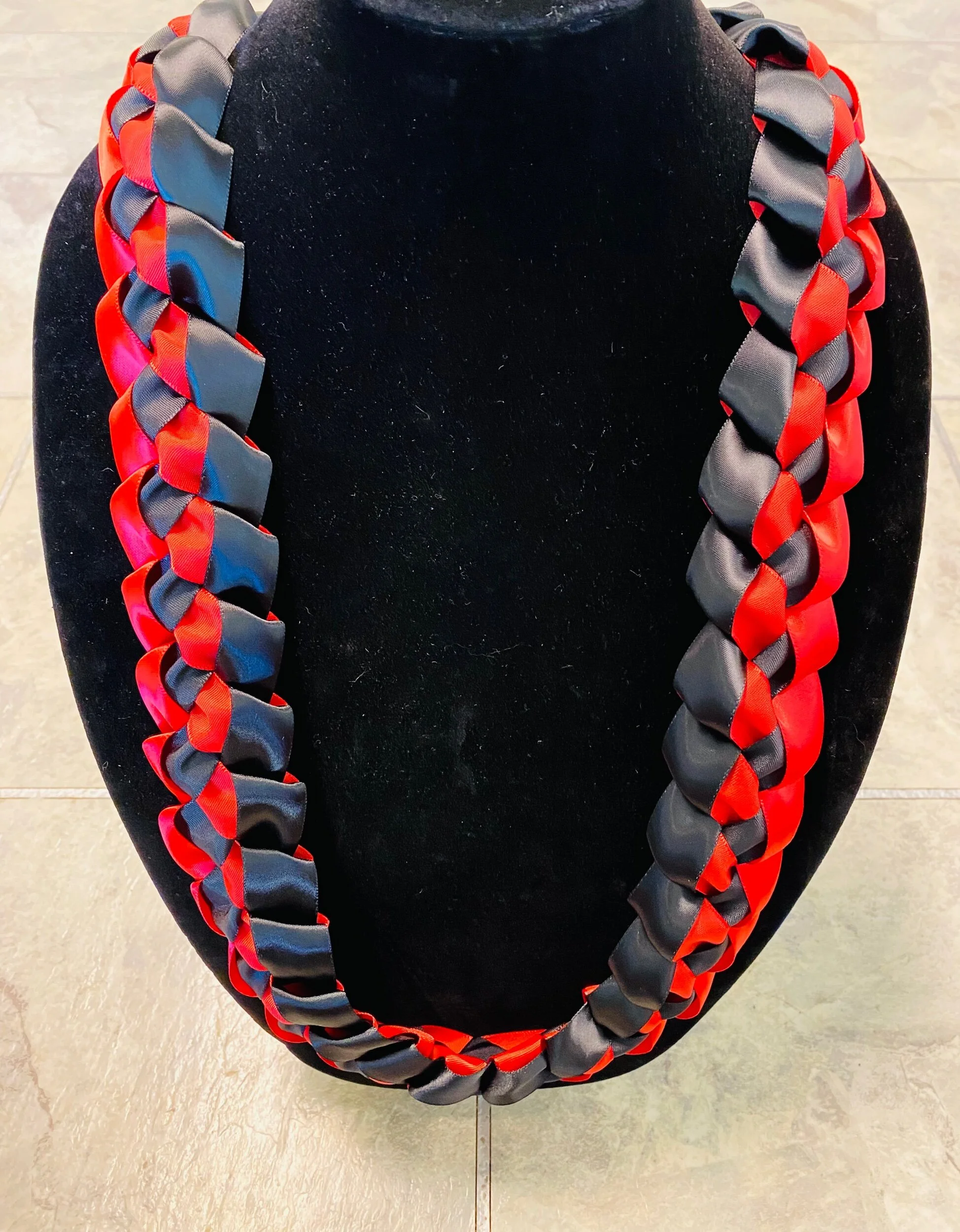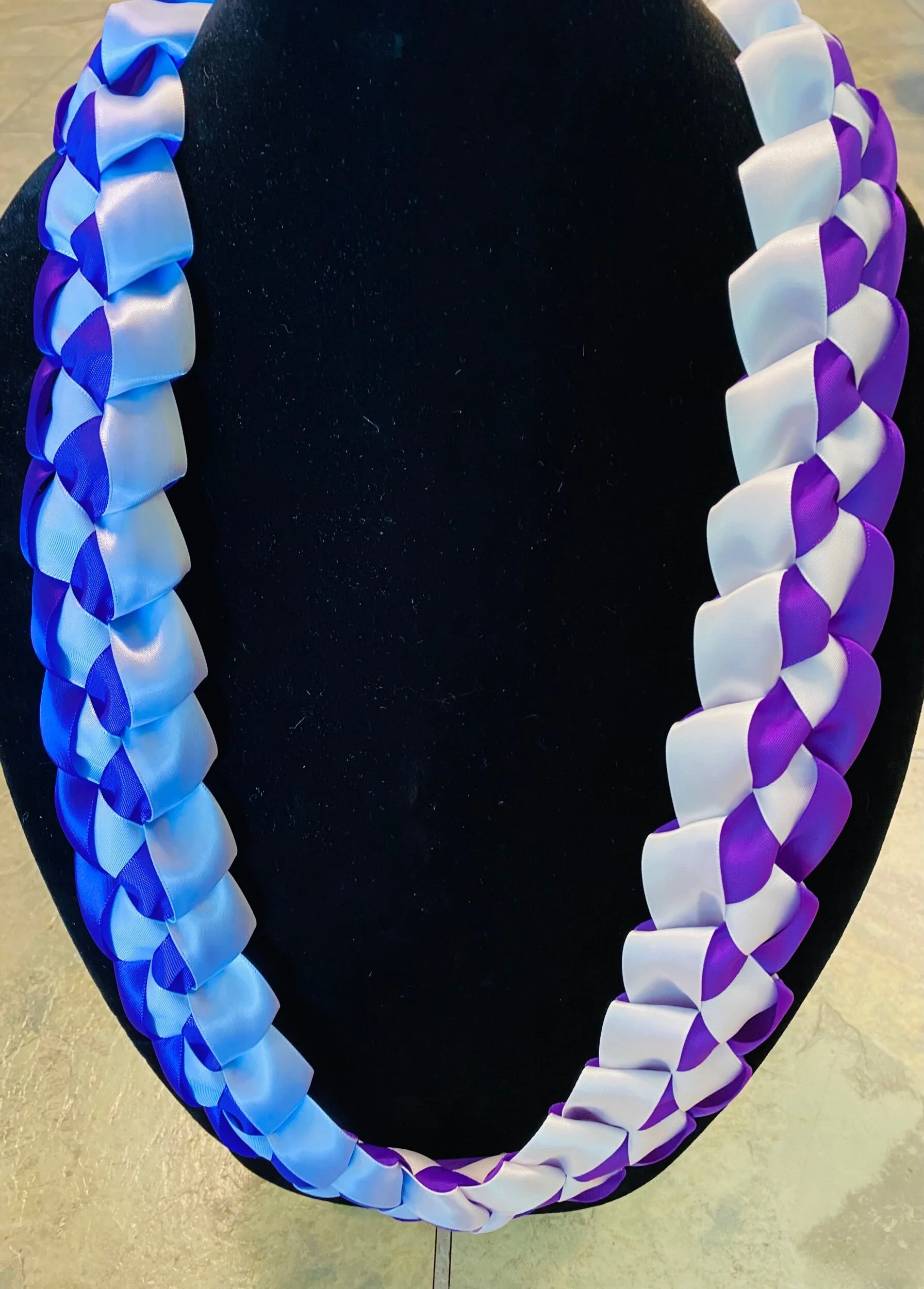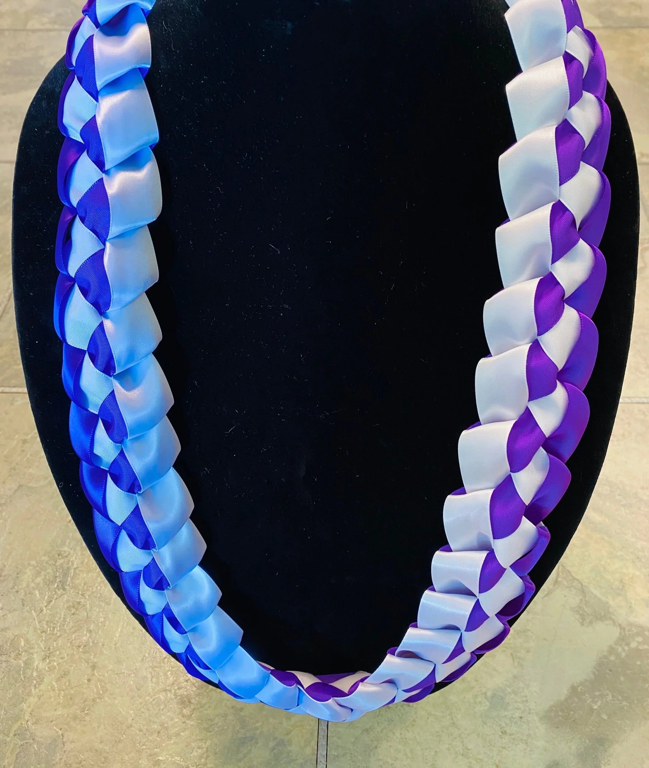 Hawaii two color 7/8 inch satin ribbon lei. This lei is made using two different colors of 7/8 inch satin ribbon. It will look nice and luxurious on the wearer. You can order these in a variety of colors. Please select your color choices at check out. The lei measures 40 inches when untied for the braided section of the lei. This is a great gift for the graduate or someone special!