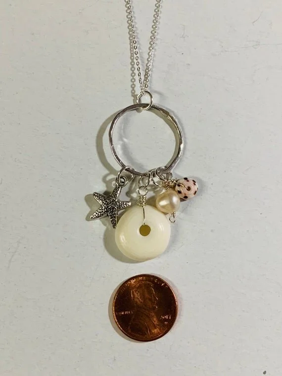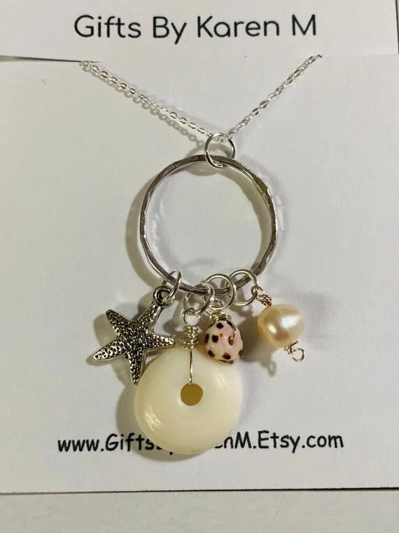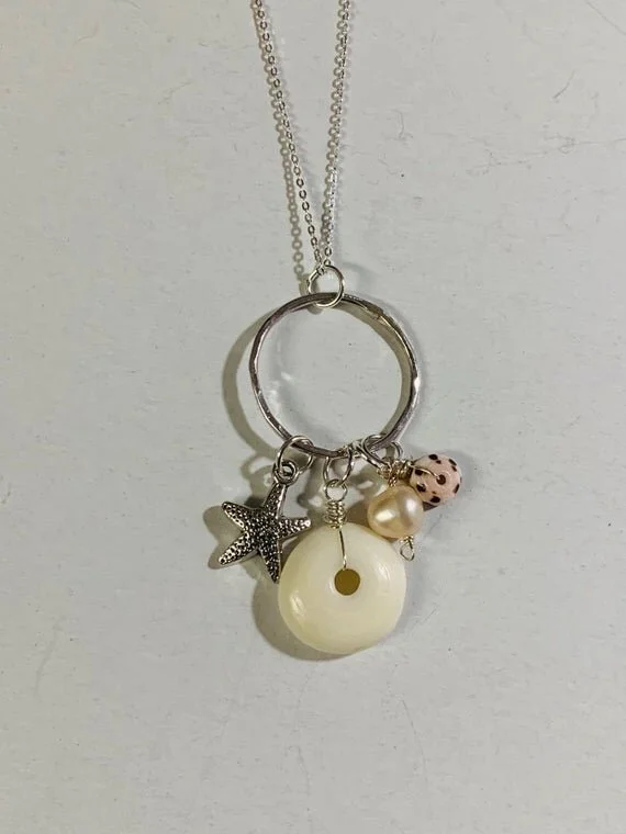 Hawaii Puka Shell Sterling Silver Hoop Necklace With Fredh Water Pearl, Shell, And Pewter Starfish Charms