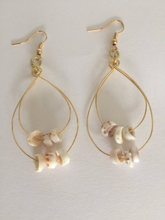Hawaiian Sea Shells Gold plated wire double hoop earrings. The gold plated wire and earring hooks are tarnish resistant and nickel and lead free. These precious Hawaiian shells were hand picked from the beaches of Hawaii. This is a great keepsake gift for someone special! Actual shells may vary. Each pair of earrings is unique!