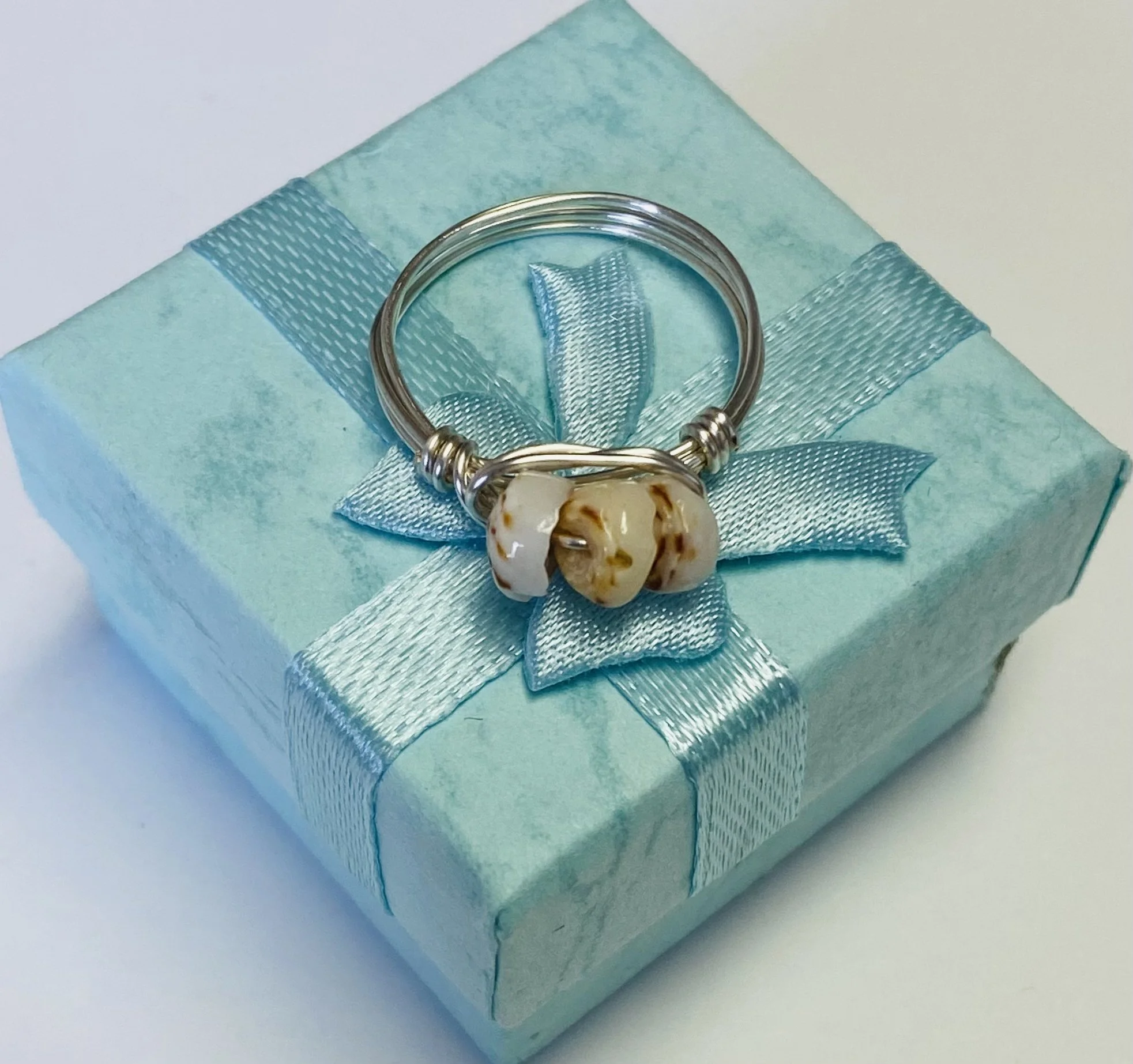 Hawaii genuine Heishi Puka shells gold or silver wire wrapped ring. The gold or silver plated wire is nickel free and tarnish resistant making it perfect for sensitive skin. Select your choice of material and size at check out. A great keepsake gift for a loved one!
