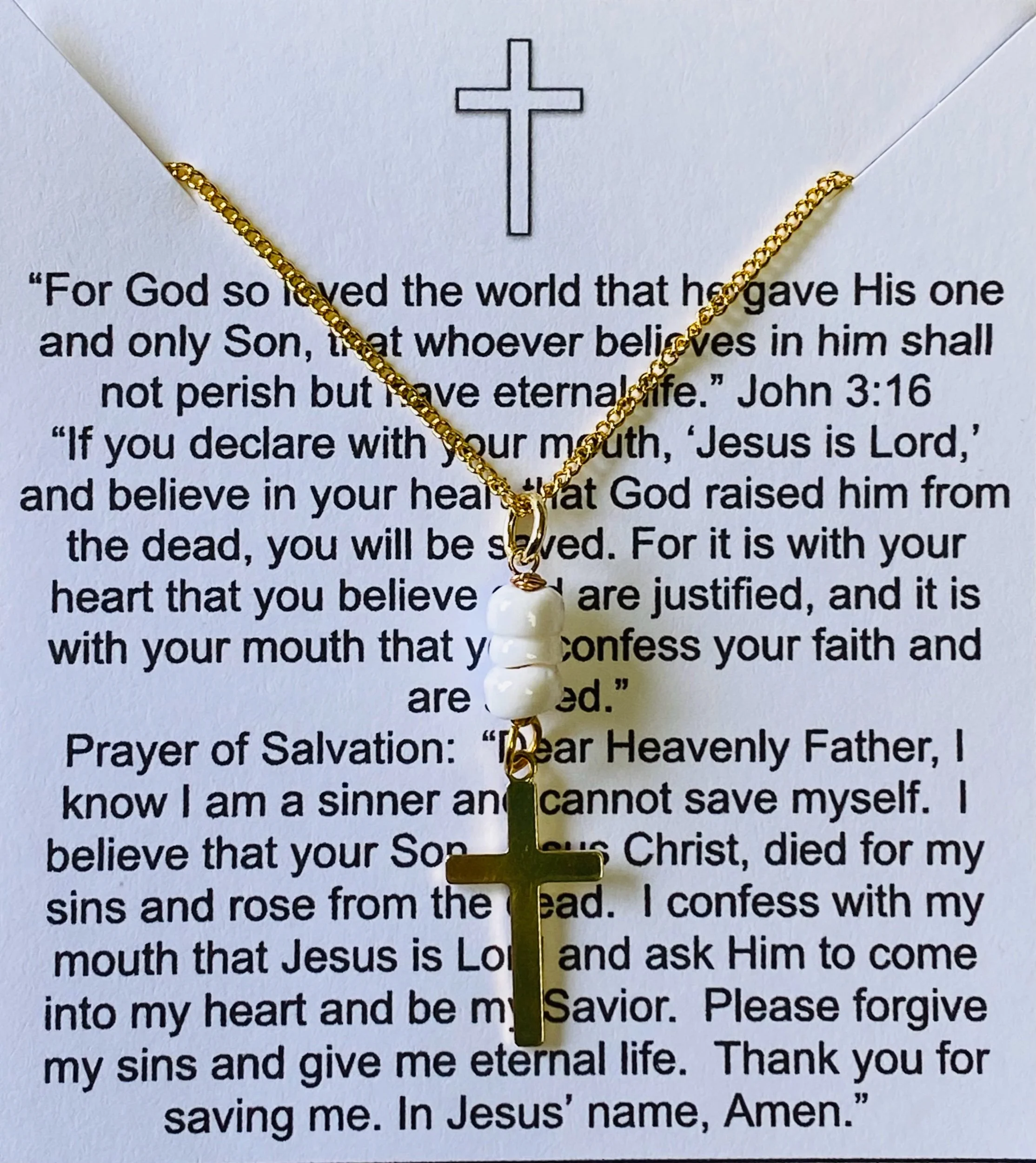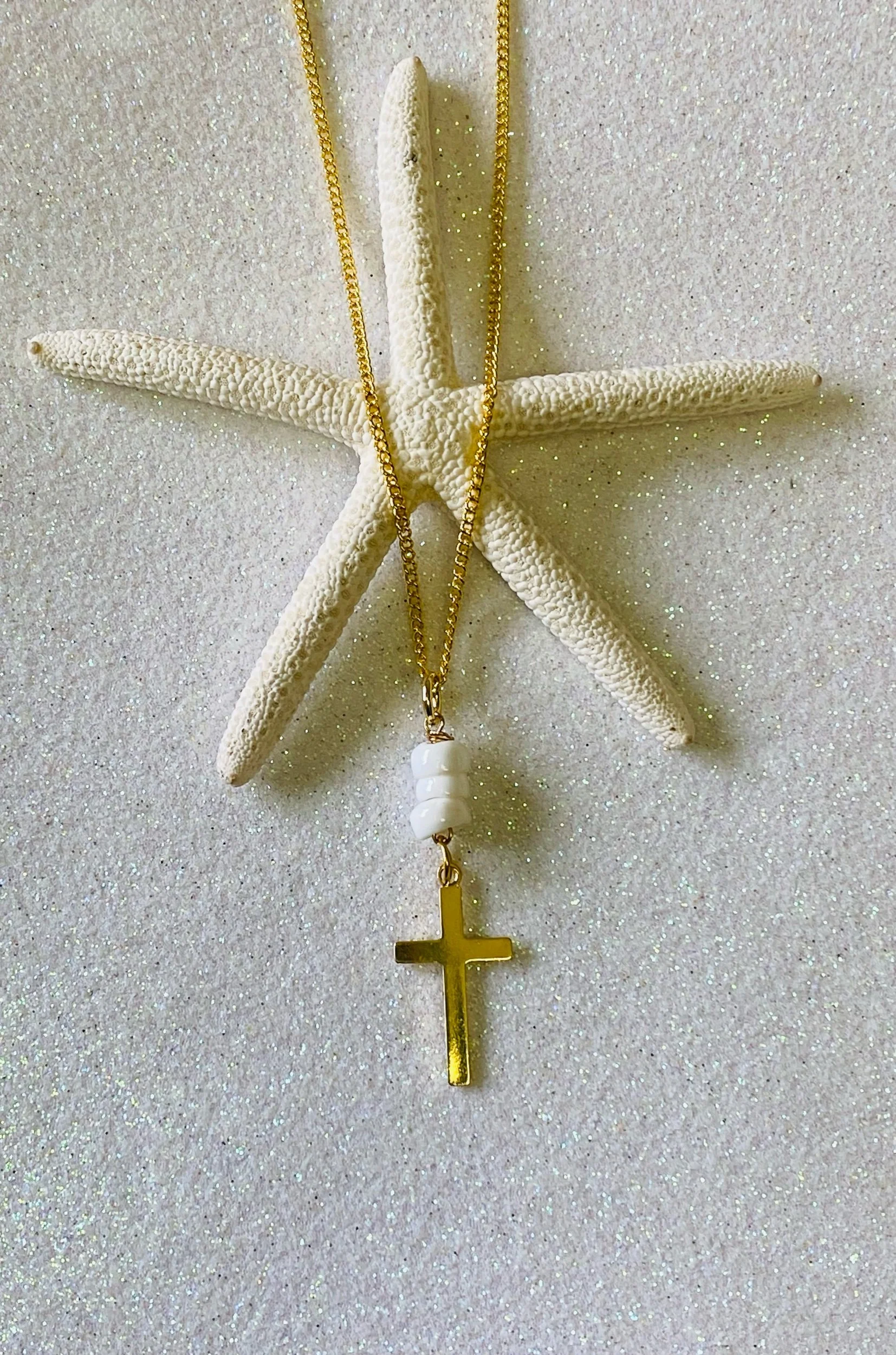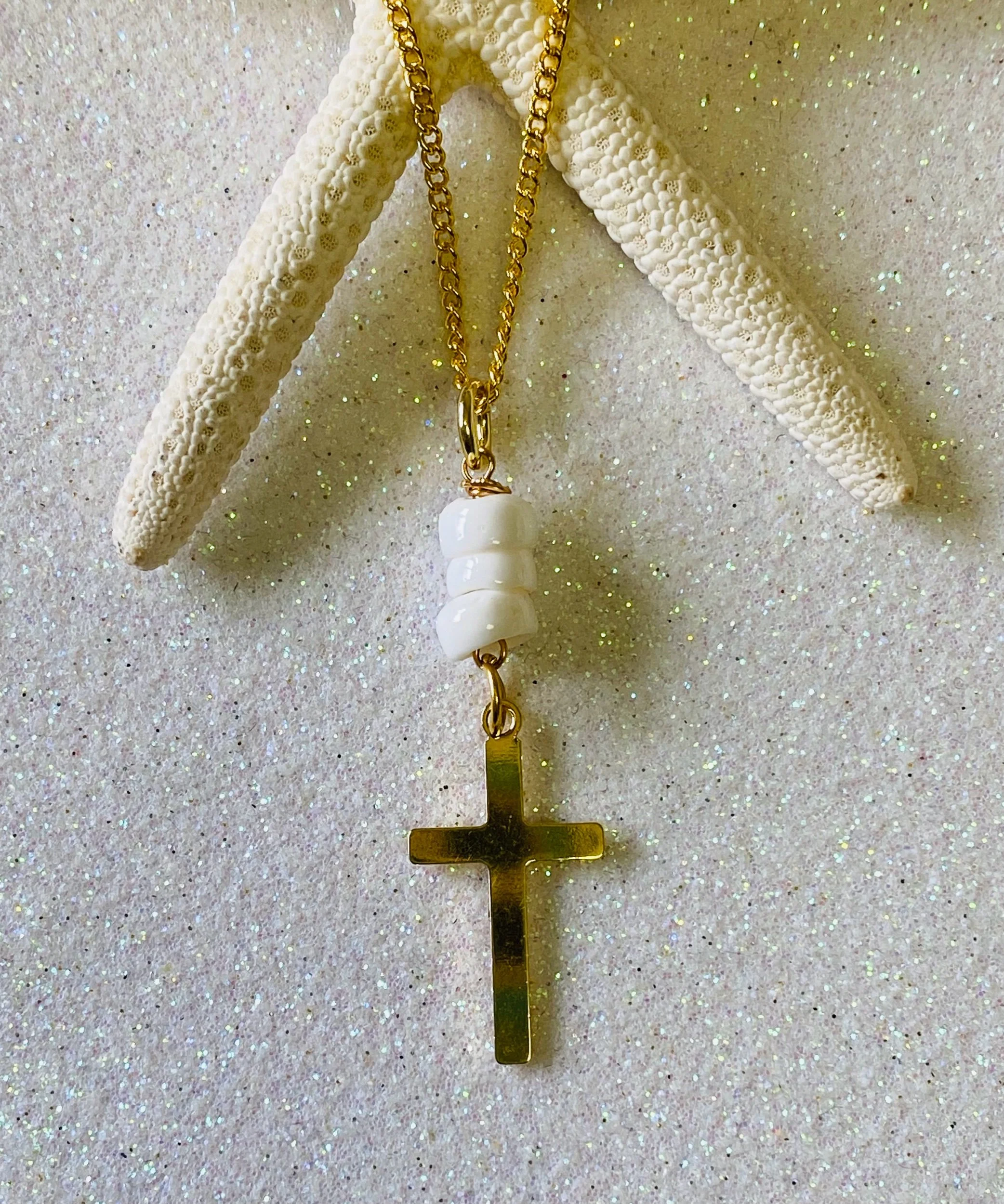 Hawaii gold plated 7/8” cross necklace with a genuine Puka Shell charm set on a gold plated chain that can be customized to your length at check out. It comes set on a necklace card with Biblical Scripture and a special prayer to share with a loved one. This is a great gift to give a loved one!