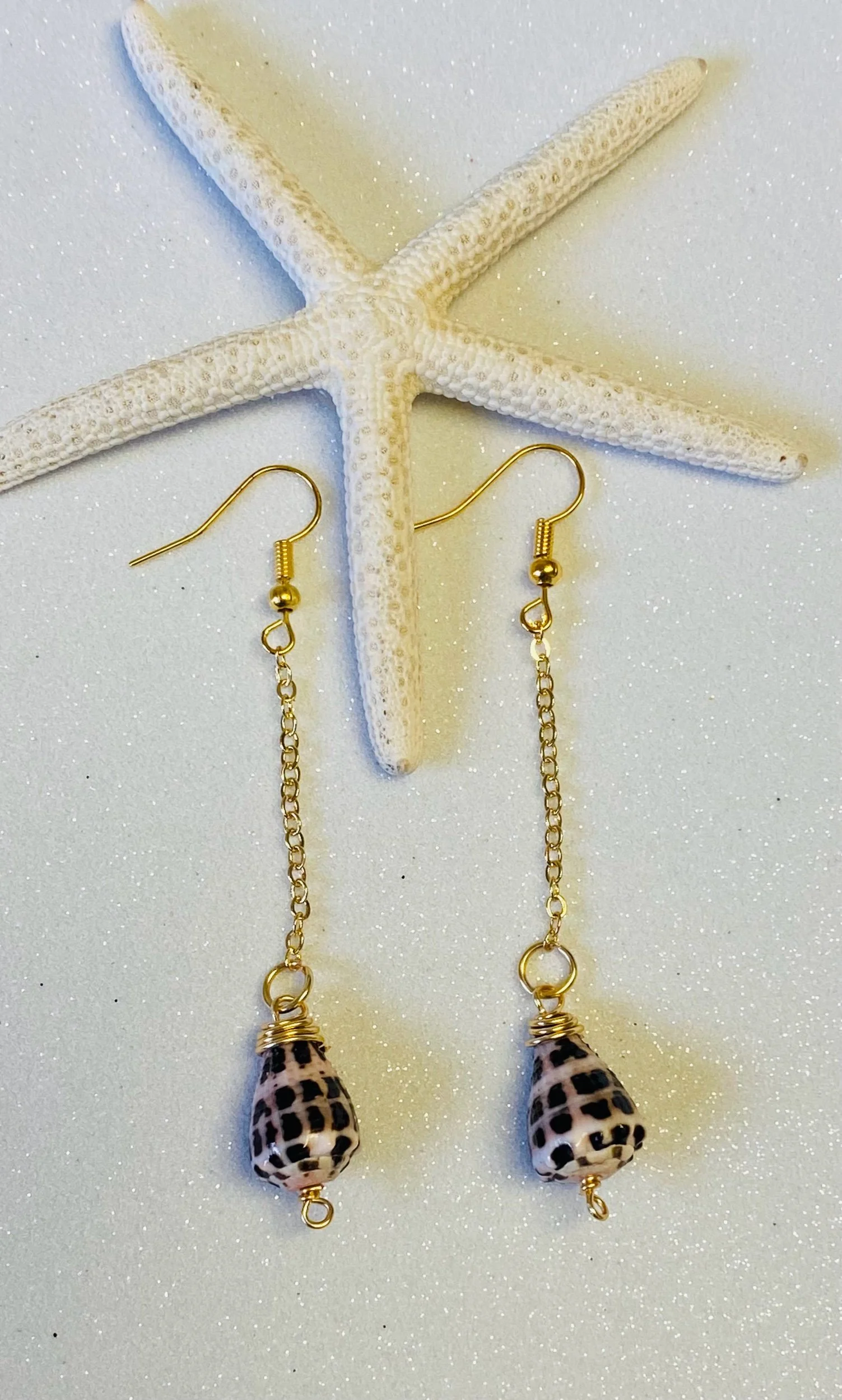 Hawaii Hebrew cone Shell gold or silver plated dangling chain earrings. The dangling chain and ear wires are nickel free and tarnish resistant. You can select your choice of material and chain length at check out. The cone shells are approximately .75 inches tall. These exact shells may have been sold but a pair just as beautiful can be made for you. A great gift for someone special!